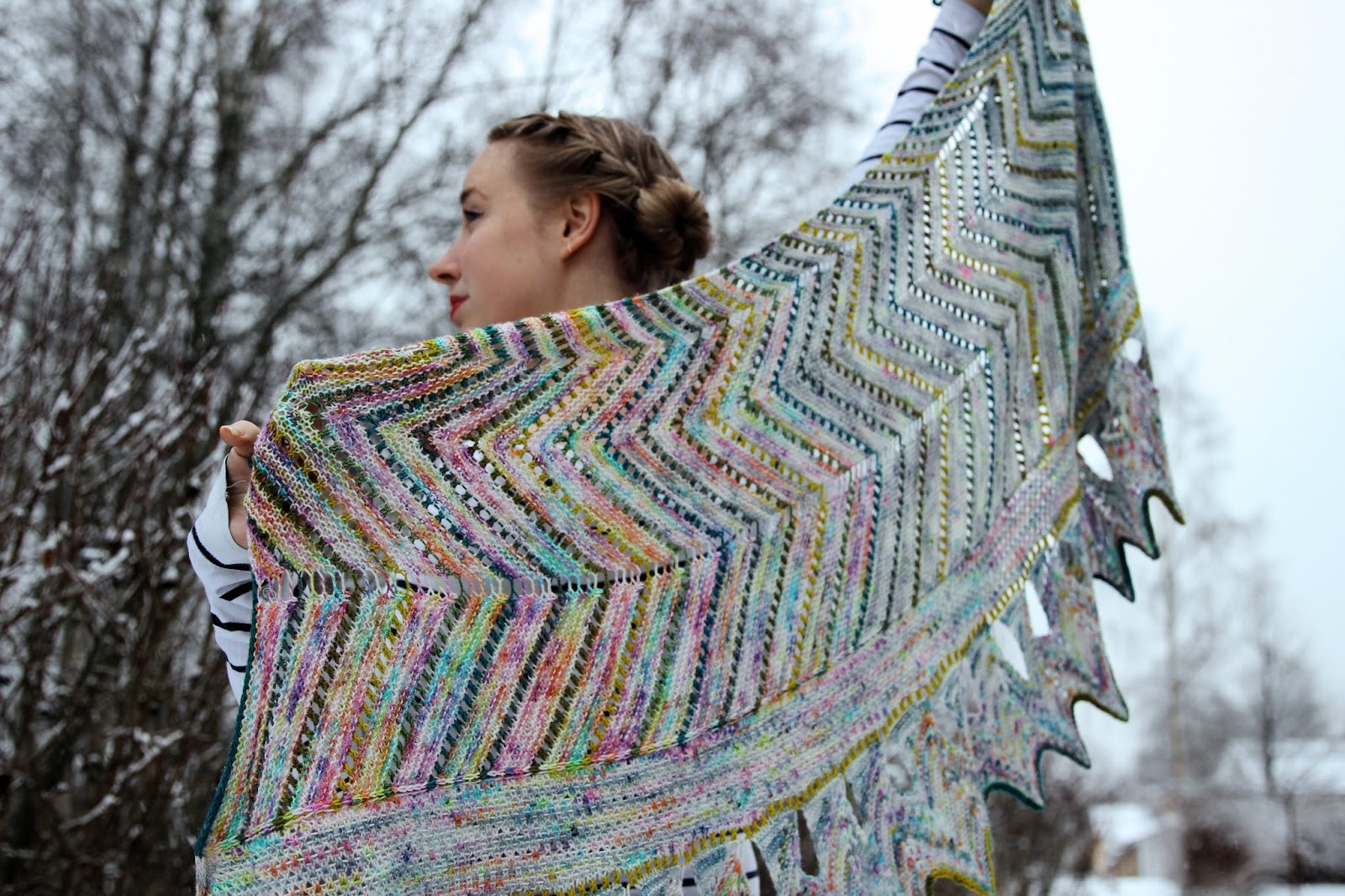 Summa summarum: tästähän tuli aika sievä huivi. Happotripit rauhoittuivat kokonaisuudessa huomattavasti ja jättireiätkin saatiin ojennukseen lopulta. Oli ehdottomasti mielenkiintoinen neulottava, kun siitä näin irtosi asiaa.