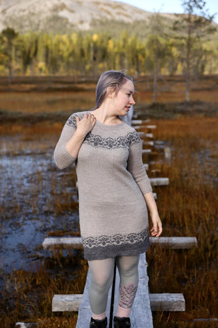 Kirjoneuleen vuoksi mallissa ei ole rinnan muotolaskosta, mutta puseroon on helppo lisätä pituutta. Niska muotoillaan lyhennetyin kerroksin ennen kirjoneuleen aloittamista.